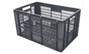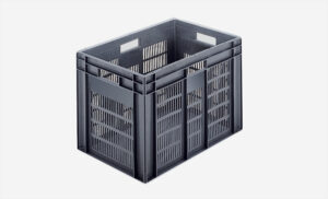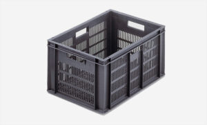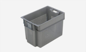 Plastlåda 600x400x320mm, 60 liter, grå, konisk, perforerad